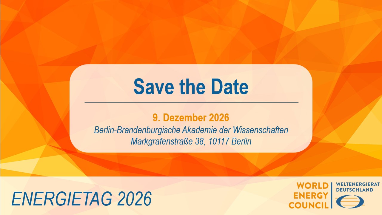 Der Weltenergierat – Deutschland lädt Sie herzlich zu seinem ENERGIETAG 2026 ein, der am 09. Dezember 2026 traditionell in der Berlin-Brandenburgischen Akademie der Wissenschaften (BBAW) in Berlin stattfinden wird. Am selben Tag findet ebenfalls die jährliche Mitgliederversammlung statt, zu der wir noch gesondert einladen werden. Merken Sie sich den 09. Dezember 2026 in Berlin bereits heute vor.