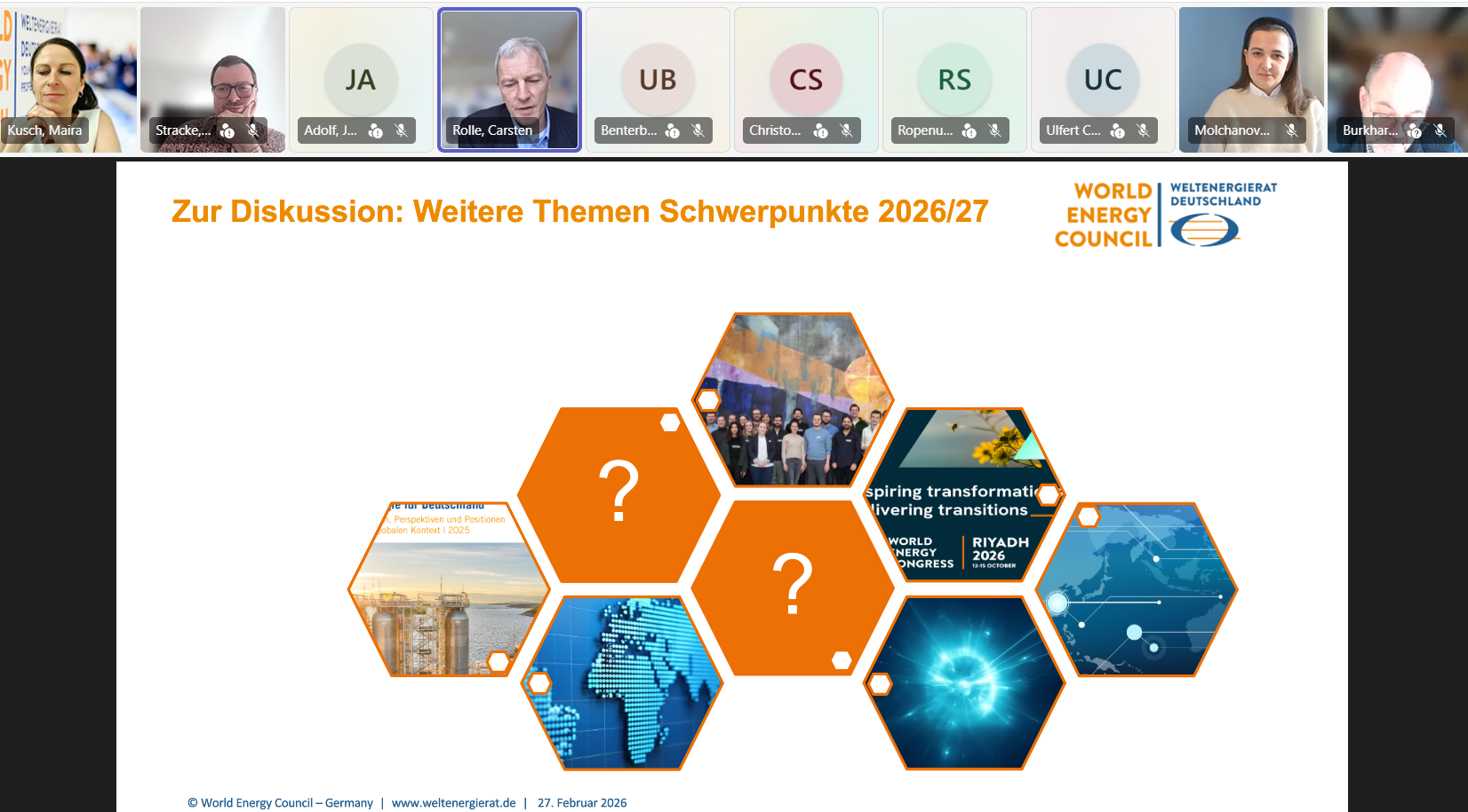 Während des ersten Members' Call des Jahres warf die Weltenergierat-Geschäftsstelle u. a. einen Blick auf laufende und anstehende Aktivitäten im Jahr 2026. Ein Highlight wird der World Energy Congress sein, der vom 12. bis 15. Oktober 2026 in Riad, Saudi-Arabien stattfinden wird und an dem wir als deutsches Mitgliedskomitee im World Energy Council vertreten sein werden. Weitere Höhepunkte werden unsere Jahrestagung, der Energietag, am 09. Dezember 2026 sowie die Expert Talks on Energy Market Developments and Geopolitics im August sein.