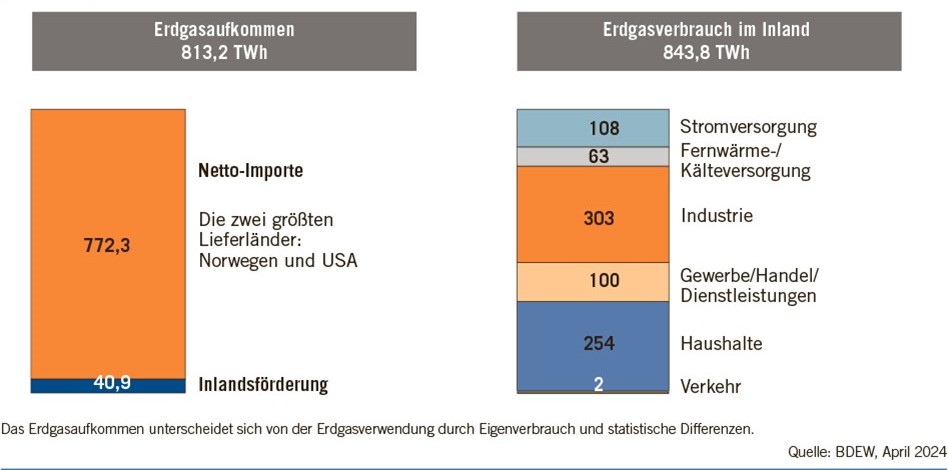 Deutschland verfügt nur über geringe eigene Erdgasvorkommen und deckt rund 95 % seines Bedarfs über Importe. Die wichtigsten Lieferanten sind Norwegen (48 %) und die Niederlande (knapp 5 %). Rund 69 Mrd. kWh verflüssigtes Erdgas (LNG) wurden 2024 über die schwimmenden Terminals (FSRU) an deutschen Küsten eingespeist, davon 92 % aus den USA. Weitere 39 % der Importe kamen über LNG-Terminals in den Niederlanden und Belgien ins europäische Pipeline-Netz. Aufgrund der engen Verflechtung der europäischen Pipelines lassen sich manche Mengen nicht eindeutig einem Herkunftsland zuordnen.